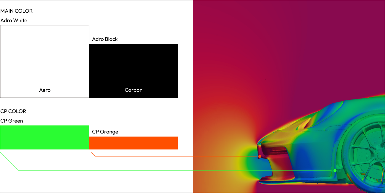 私たちのビジュアルスタイルは、色の選び方に至るまで、空力科学の本質を反映しています。純粋で目に見えない空気を表すAero Whiteと、私たちを象徴する素材であるCarbon Blackを軸に、Computational Fluid Dynamics(CFD)解析において空気抵抗の分布を示すスペクトルから着想を得た色で重要な領域を際立たせています。これらのCP(Coefficient of Point)カラーは、改善が求められる箇所や主要な性能指標に視線を導く役割を果たします。